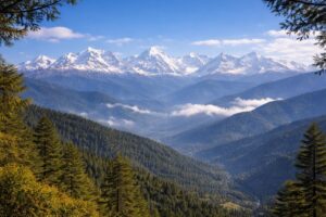 ये कोई साधारण दृश्य नहीं था। नीचे हरे-भरे जंगल बीच में धुंध की लहरें और ऊपर ये सफेद, चमकती चोटियाँ